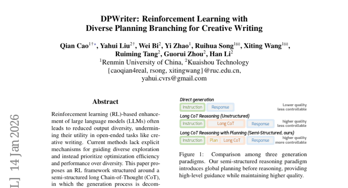 创意写作一直是人类独有的艺术天赋,但随着人工智能的快速发展,机器是否也能拥有创造力成为了一个引人深思的话题。最近,中国人民大学联合快手科技的研究团队发表了一项突破性研究,他们开发出了一个名为DPWriter的AI写作系统,这项研究于2025年1月发表在arXiv预印本平台上,编号为arXiv:2601.09609v1。有兴趣深入了解的读者可以通过该编号查询完整论文。