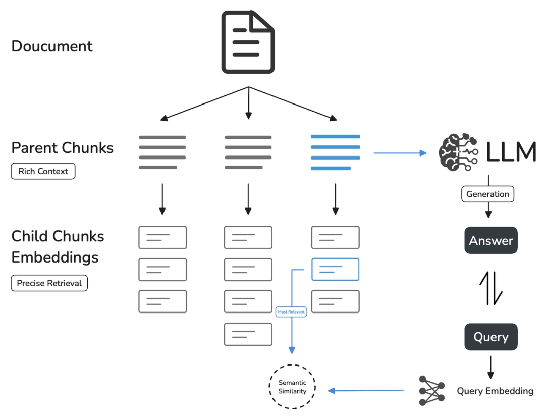 父子分段与通用模式相比,父子模式采用双层分段结构来平衡检索的精确度和上下文信息,让精准匹配与全面的上下文信息二者兼得。它包含了父区块(Parent - chunk)和子区块(Child - chunk)。父区块就像是一个 “信息仓库”,保持着较大的文本单位,比如段落,用于存储丰富的上下文信息。而子区块则像是一个个 “精准探测器”,是较小的文本单位,比如句子,专门用于精确检索。当用户输入问题后,子区块会迅速行动,精准匹配用户问题,找到最相关的小块信息。然后,系统再取对应的父区块来补充上下文信息,从而在生成响应时既保证准确性又能提供完整的背景信息 。例如,在一个智能法律问答系统中,用户询问关于某个具体法律条款在特定案例中的应用。子区块会首先锁定与问题关键词最匹配的句子,比如 “在 XX 案例中,XX 法律条款规定……”,然后再获取这个句子所在的整个段落作为父区块,将其发送给 LLM 。这样,LLM 就能在完整的上下文背景下进行分析和回答,不仅能给出准确的答案,还能提供相关的背景信息和解释,使回答更加全面和有说服力。
