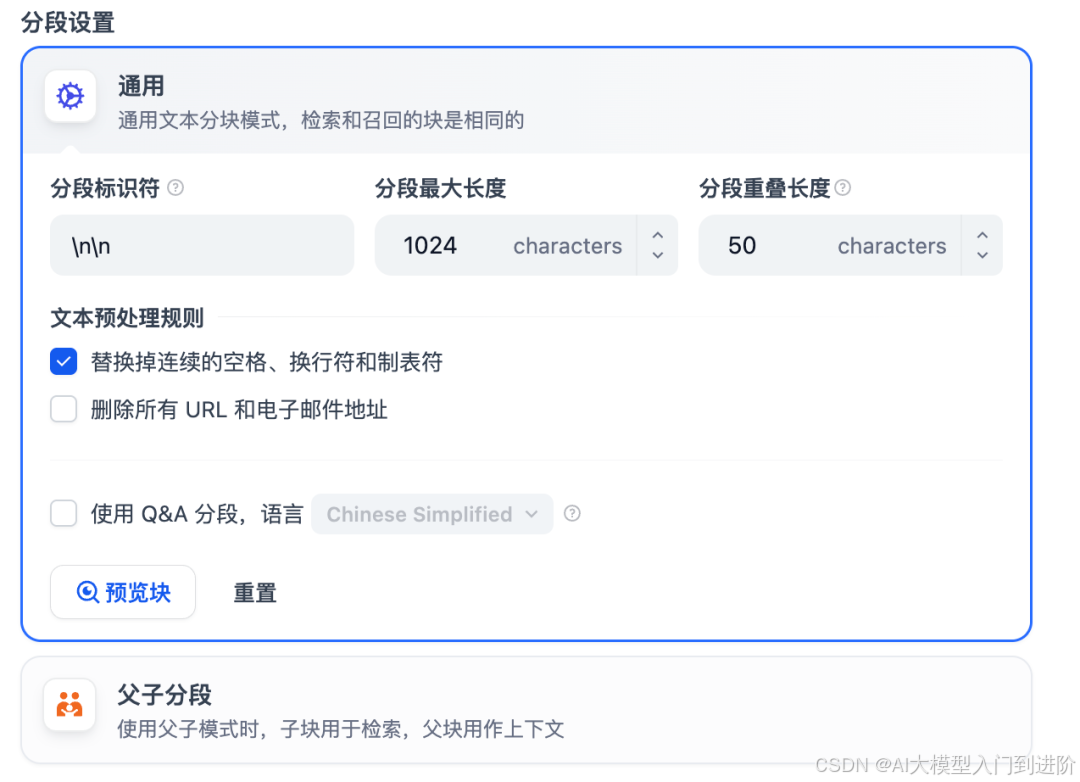 在上下文利用上,通用分段虽然也能通过设置重叠长度来保留一定的上下文信息,但相比之下,父子分段的父区块专门用于存储上下文信息,在处理需要上下文关联的问题时,具有明显的优势,能让 LLM 更好地理解问题背景,给出更贴合实际的回答。 因此,利用这些参数配置来提升检索问题的准确性。