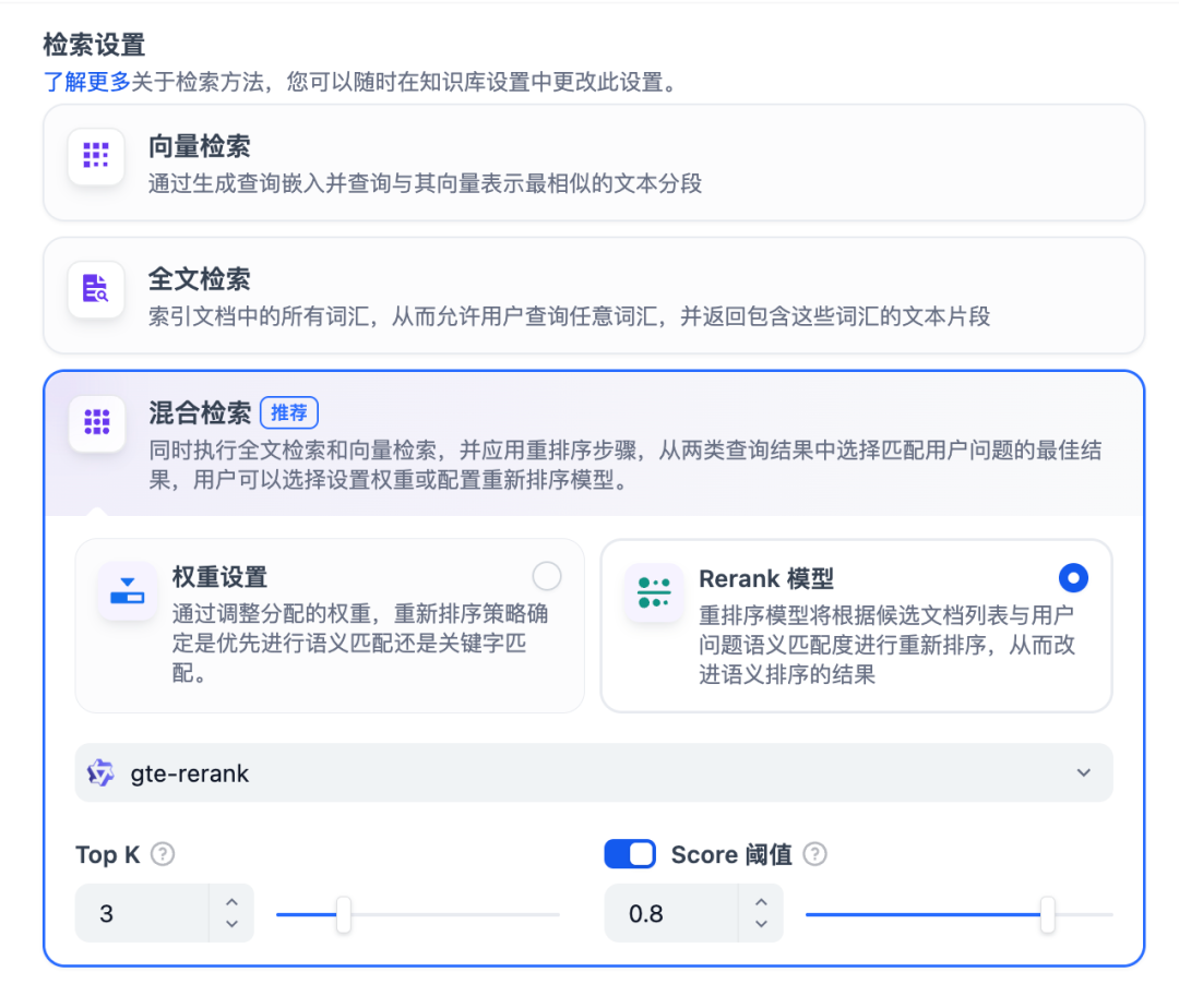 另外可以将索引方式修改成为混合检索模式,即包含向量检索,也包含全文检索,并且将两部分检索的内容重排序之后返回,另外可以调高Score的值,默认是0.5 ,可以调高到0.8,默认返回的内容和问题的语义已经非常相似了。这样整体提升从知识库返回内容的相关性,解决返回内容不全且相关性低的问题。