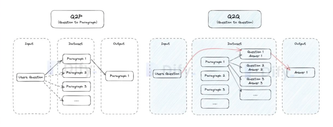 当用户提问时,系统会找出与之最相似的问题,然后返回对应的分段作为答案。这种方式更加精确,因为它直接针对用户问题进行匹配,可以更准确地帮助用户检索真正需要的信息。