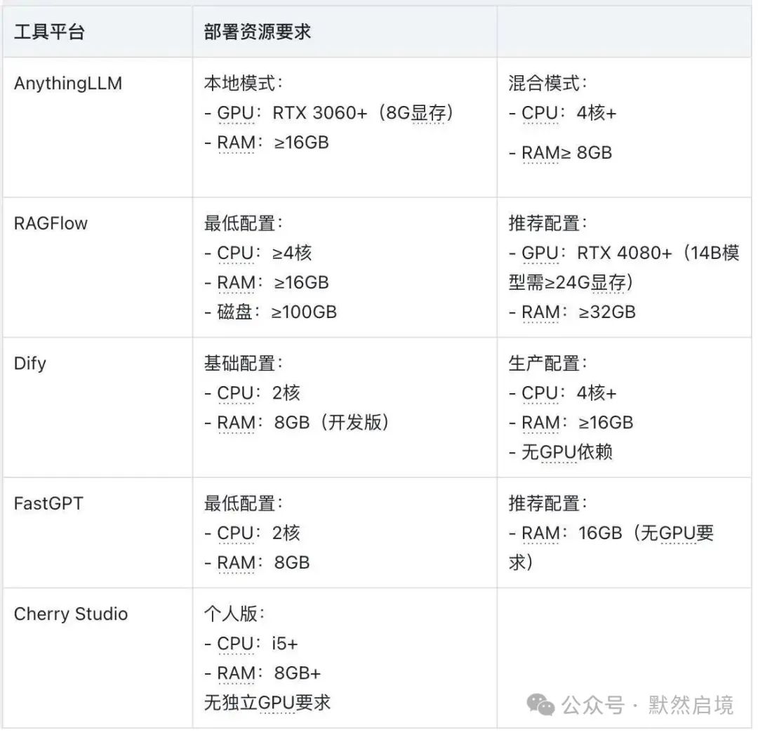 - 必须GPU:RAGFlow(复杂解析)、AnythingLLM本地模式(大模型推理)
