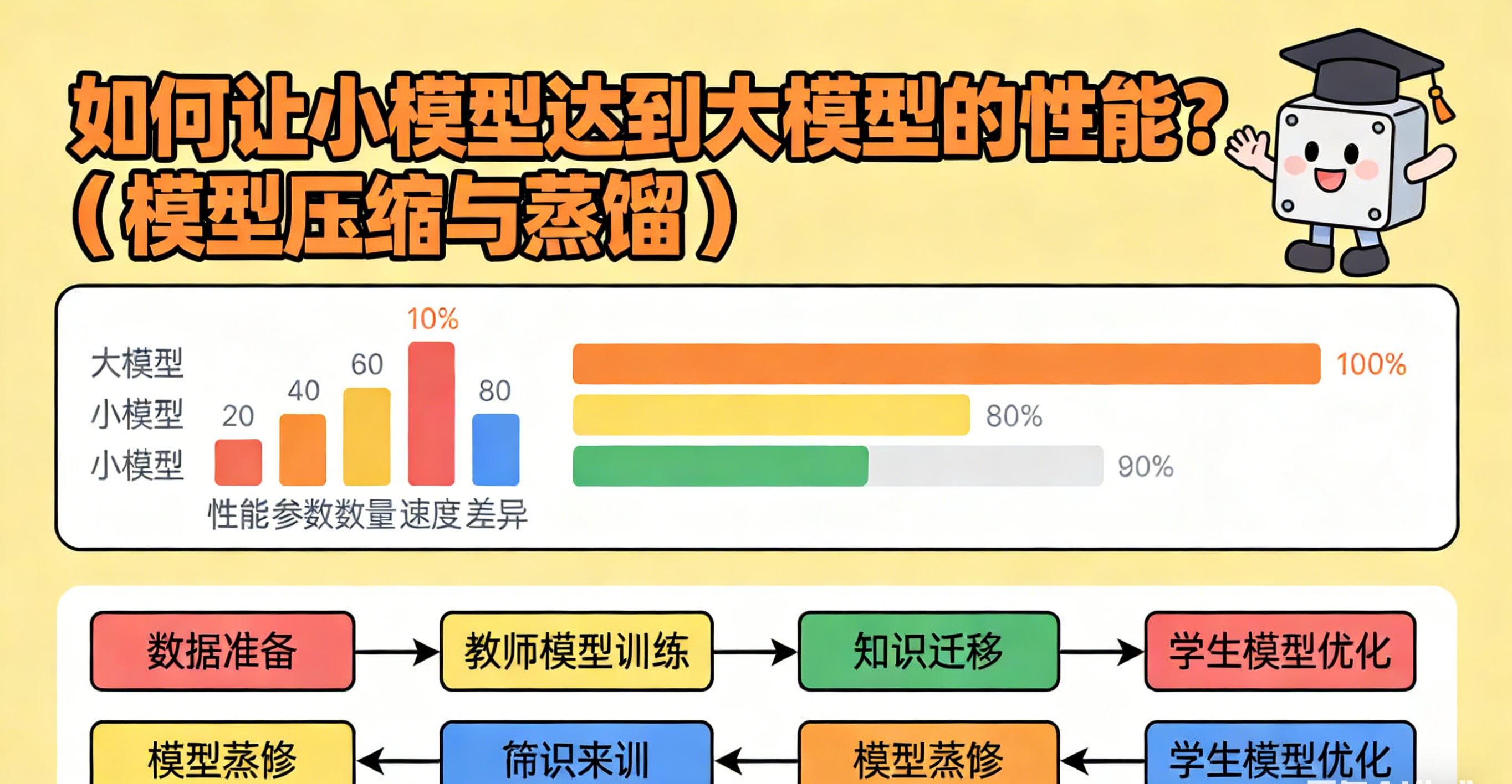 大模型的优势源于千亿级参数对海量知识的拟合能力,但部署时面临显存占用高(如175B参数模型FP16精度需350GB+显存)、推理延迟长(单条请求生成1000token需10秒+)、能耗成本高(单次推理约0.1kWh)等瓶颈。小模型要实现性能对齐,本质是通过“技术赋能”替代“参数堆砌”,核心逻辑包括两点:一是通过压缩技术精简模型结构,提升推理效率;二是通过蒸馏技术迁移大模型的“暗知识”,弥补参数量不足的性能差距。