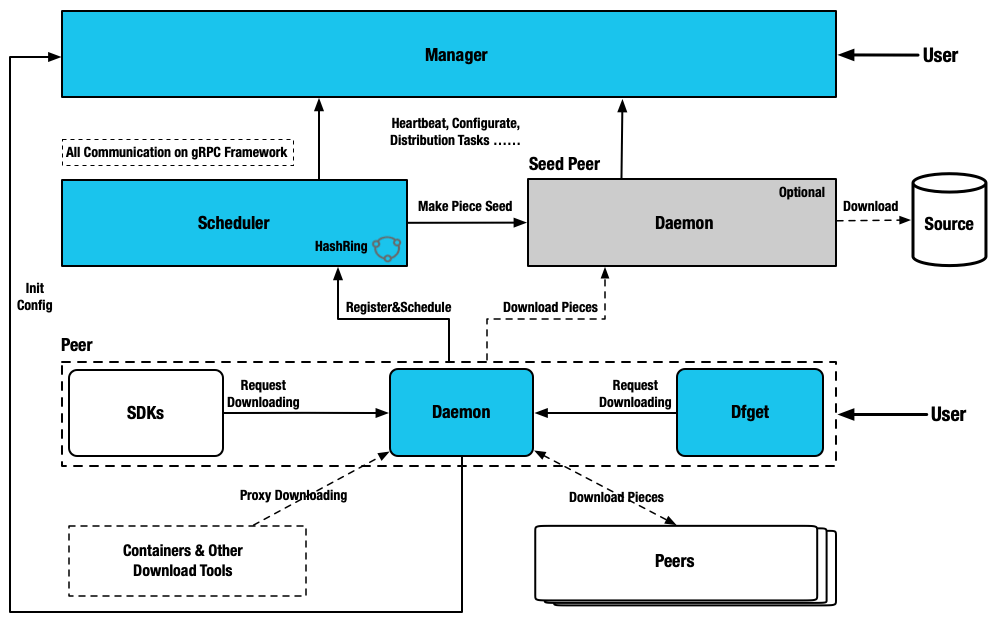Dragonfly模块为四类:管理器、调度器、种子对等节点和对等节点。