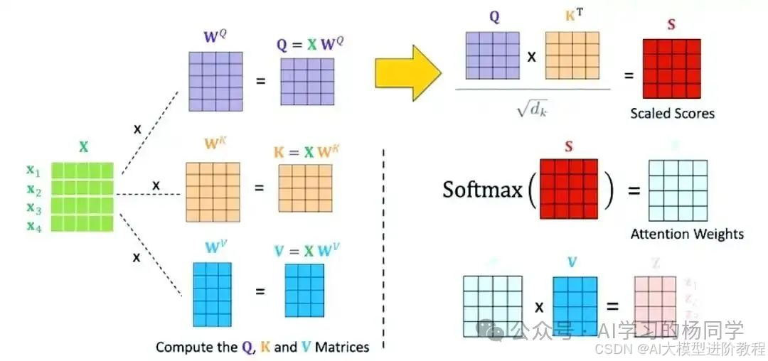 我们将输入矩阵分别与WQ、WK和WV相乘,得到Query矩阵Q、Key矩阵K和Value矩阵V。具体公式如下: