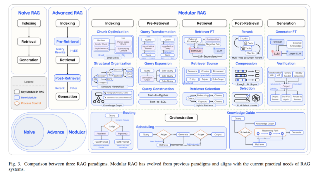 Advanced RAG:高级rag新增了检索预处理(Pre- Retrieval)和检索后处理(Post-Retrieval)两个模块,以提升rag的召回率和大模型的生成质量。