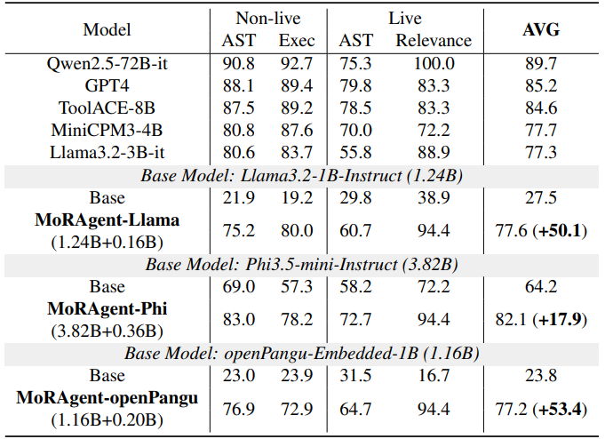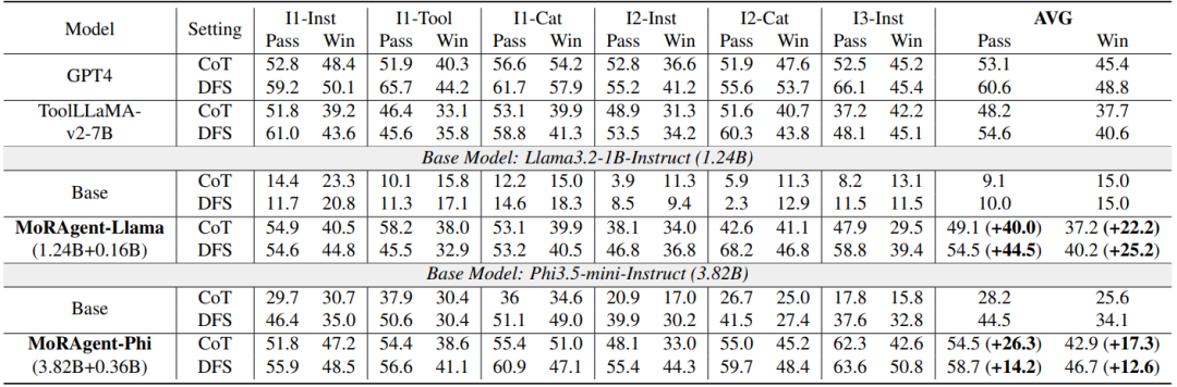 实验表明,该方法在 StableToolBench、BFCL、GSM8K 和 MATH 等多个基准上显著优于现有方法。例如,在仅增加 0.16B 可训练参数的情况下,Llama3.2-1B-Instruct 在 StableToolBench 上的 DFS 通过率提升超40%;Phi-3.5-mini-Instruct 也以仅新增 0.36B 参数实现 14.2% 的提升,充分验证了 MoR 架构在参数效率与智能体性能上的优势。