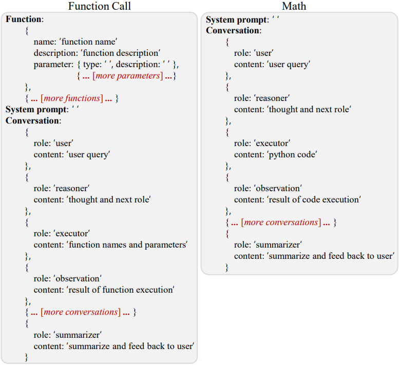 为便于下游微调,将数据统一为标准化 JSON 格式:包含可选的候选函数列表(含名称、描述、参数及是否必选)、系统提示、以及从用户查询开始的完整执行轨迹——涵盖推理者与执行者的交互、真实环境返回的观测结果(如需要),并以总结者的反馈结尾。不同场景的格式示例如图 3 所示。