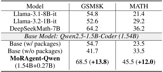 研究者进一步将所提方法应用于数学推理场景。与直接生成答案不同,该方法通过调用 Python 包(编写可执行代码,并在真实环境中运行以求解数学问题。实验采用 Qwen2.5-1.5B-Coder 作为基础模型,并基于 ToRA 框架进行推理与评估。为全面衡量性能,对基础模型分别在两种设置下进行测试:使用 Python 包执行代码和不使用 Python 包、仅依赖语言生成。表3表明,在仅引入 0.27B 可训练参数的情况下,研究团队的方法显著优于基线:在 GSM8K 和 MATH 数据集上,相比两种基线设置中的最佳准确率,分别提升了 13.8% 和 12.0%。