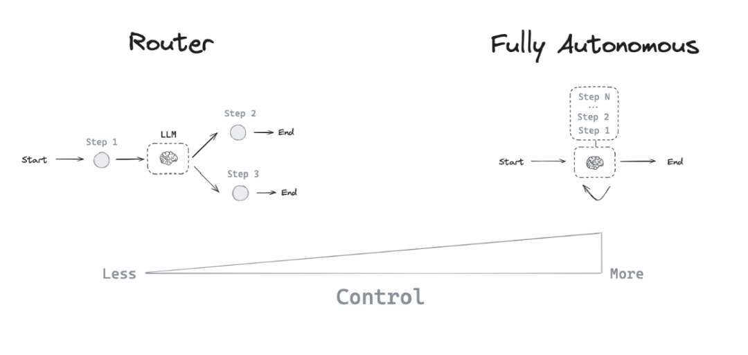 因此,有许多不同类型的智能体架构,它们赋予 LLM 不同程度的控制能力。