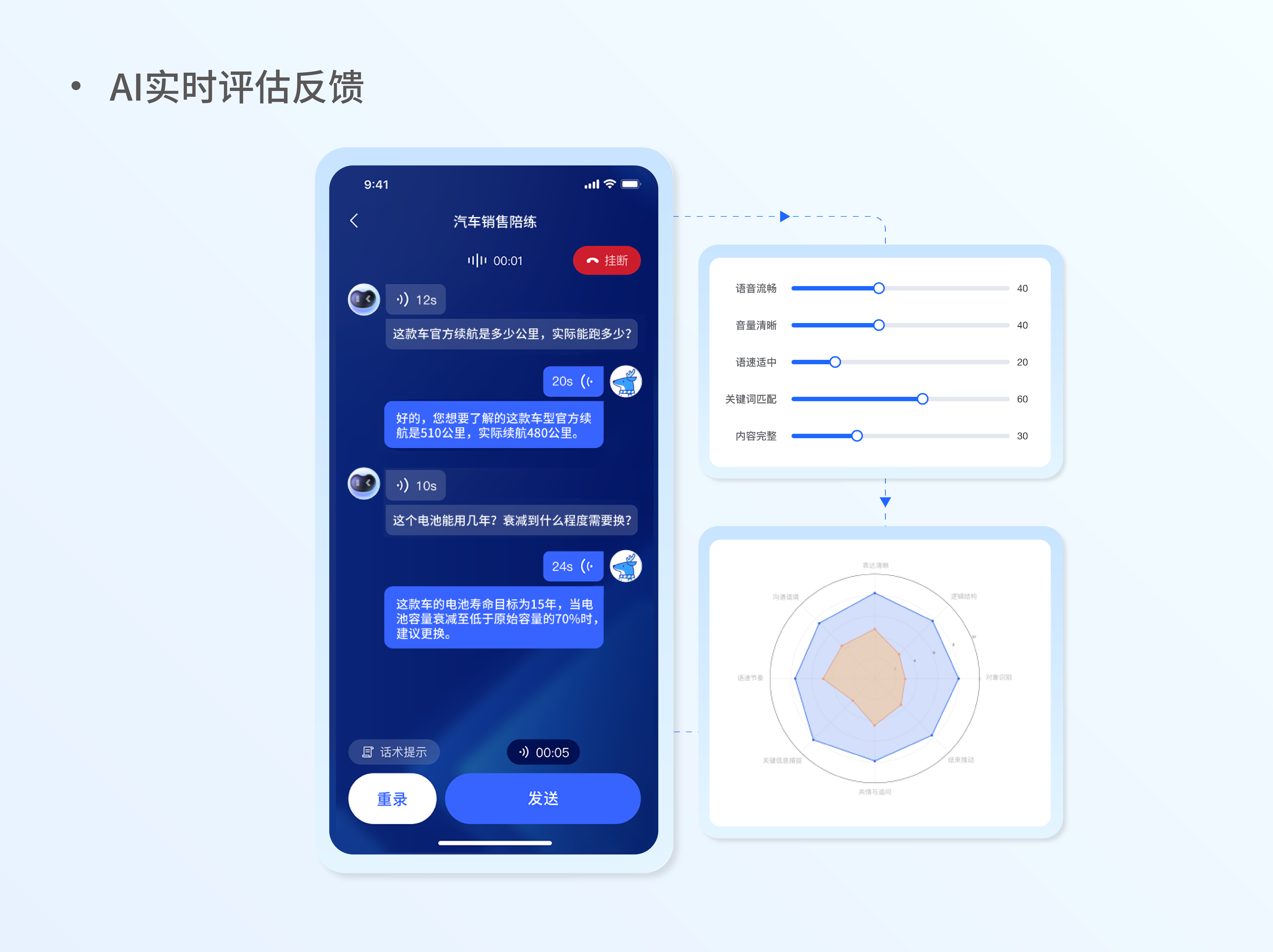 应用场景:训练车型亮点讲解、试驾需求挖掘、金融方案推荐、竞品差异化对比。