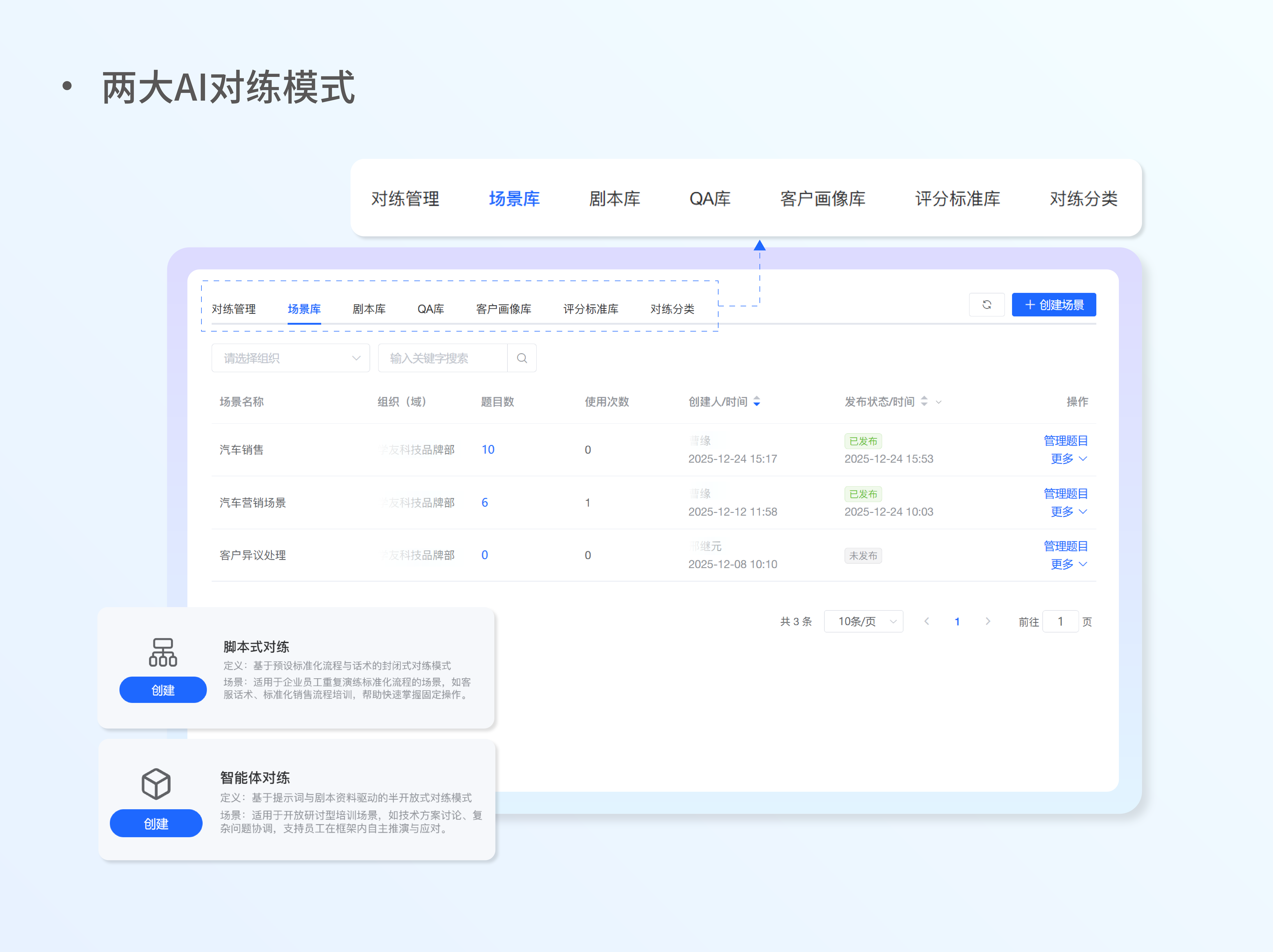 企学宝AI智能陪练支持脚本式对练+智能体对练两大模式,通过场景化实战模拟,让培训紧贴真实销售战场。
