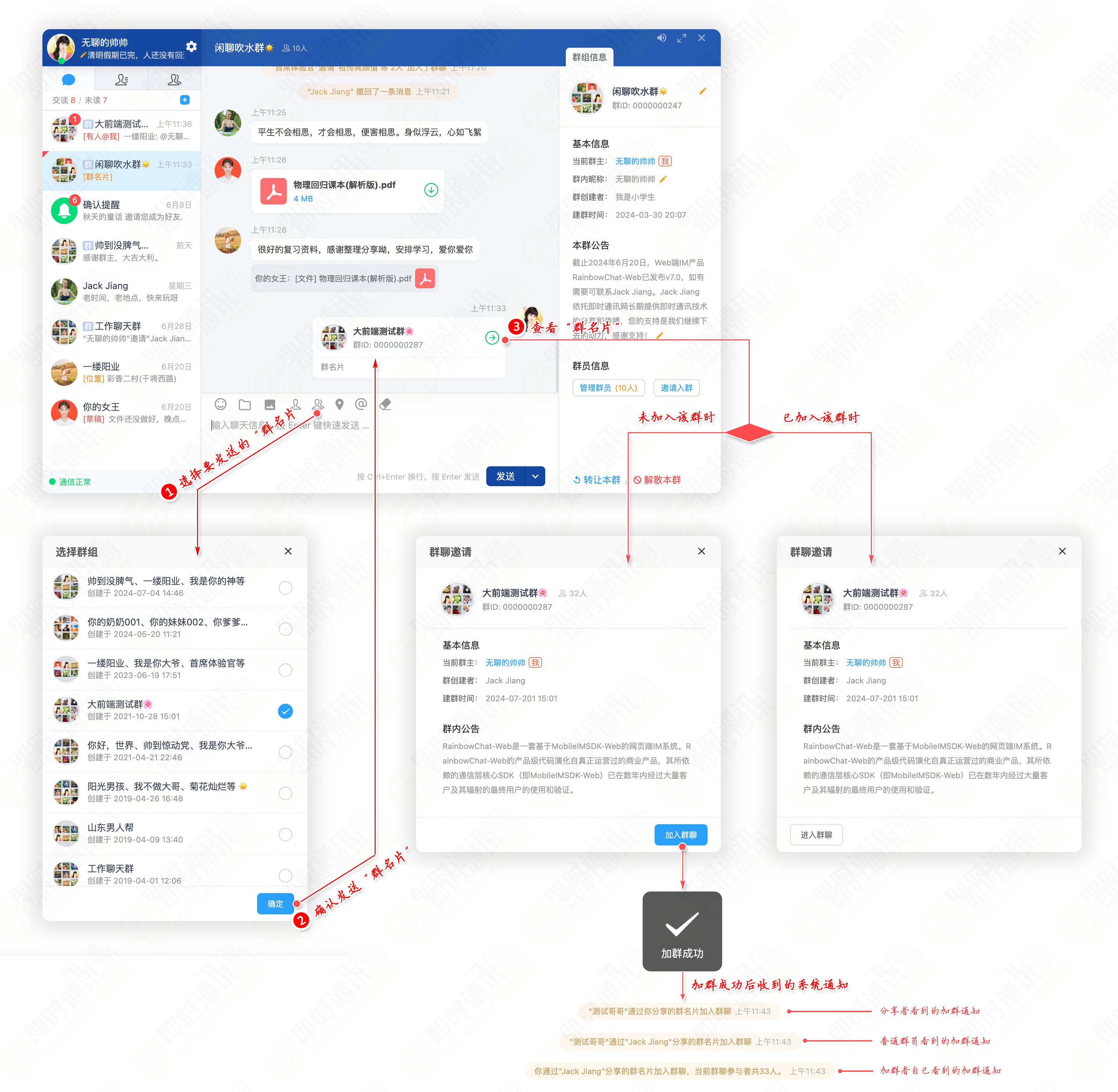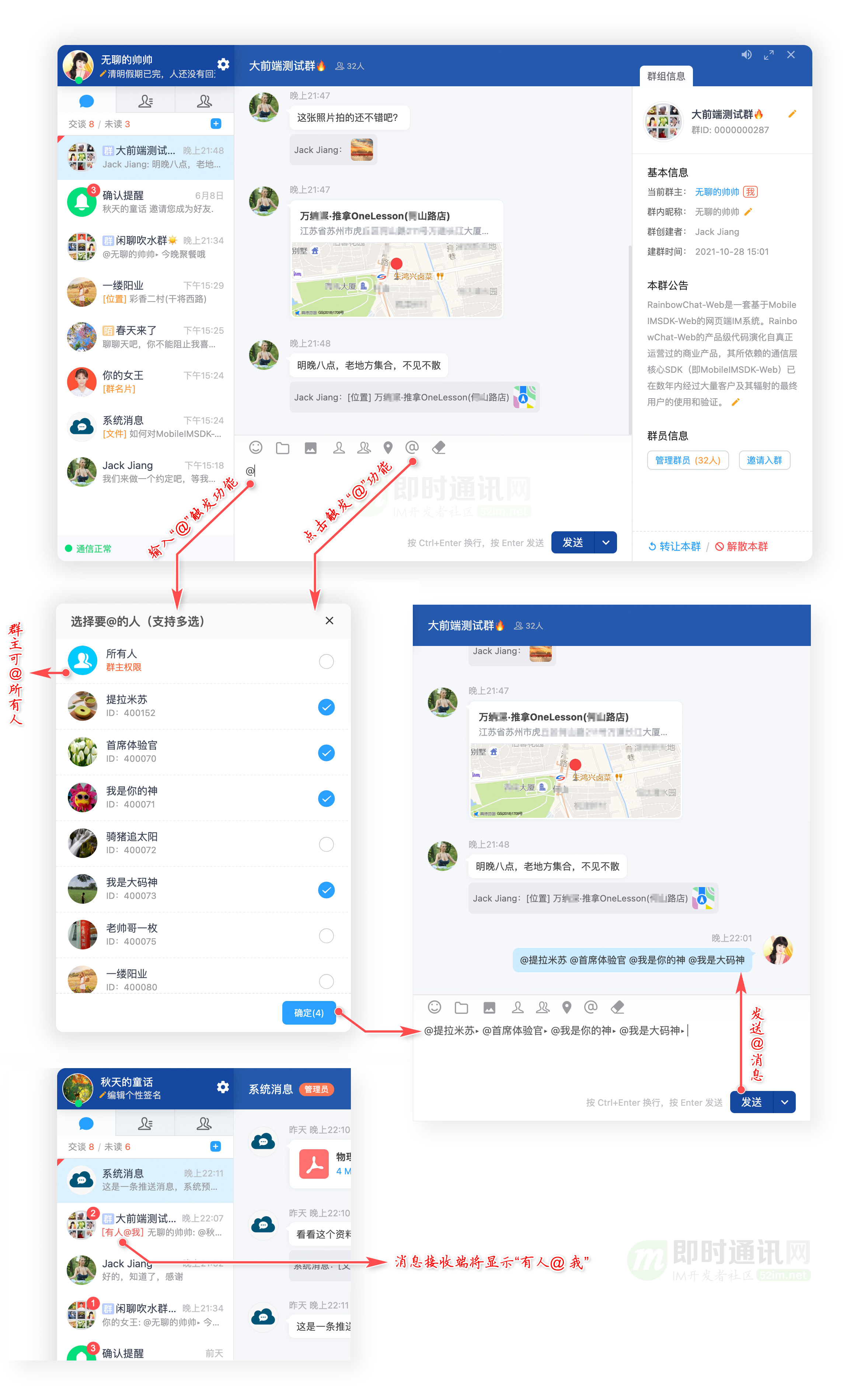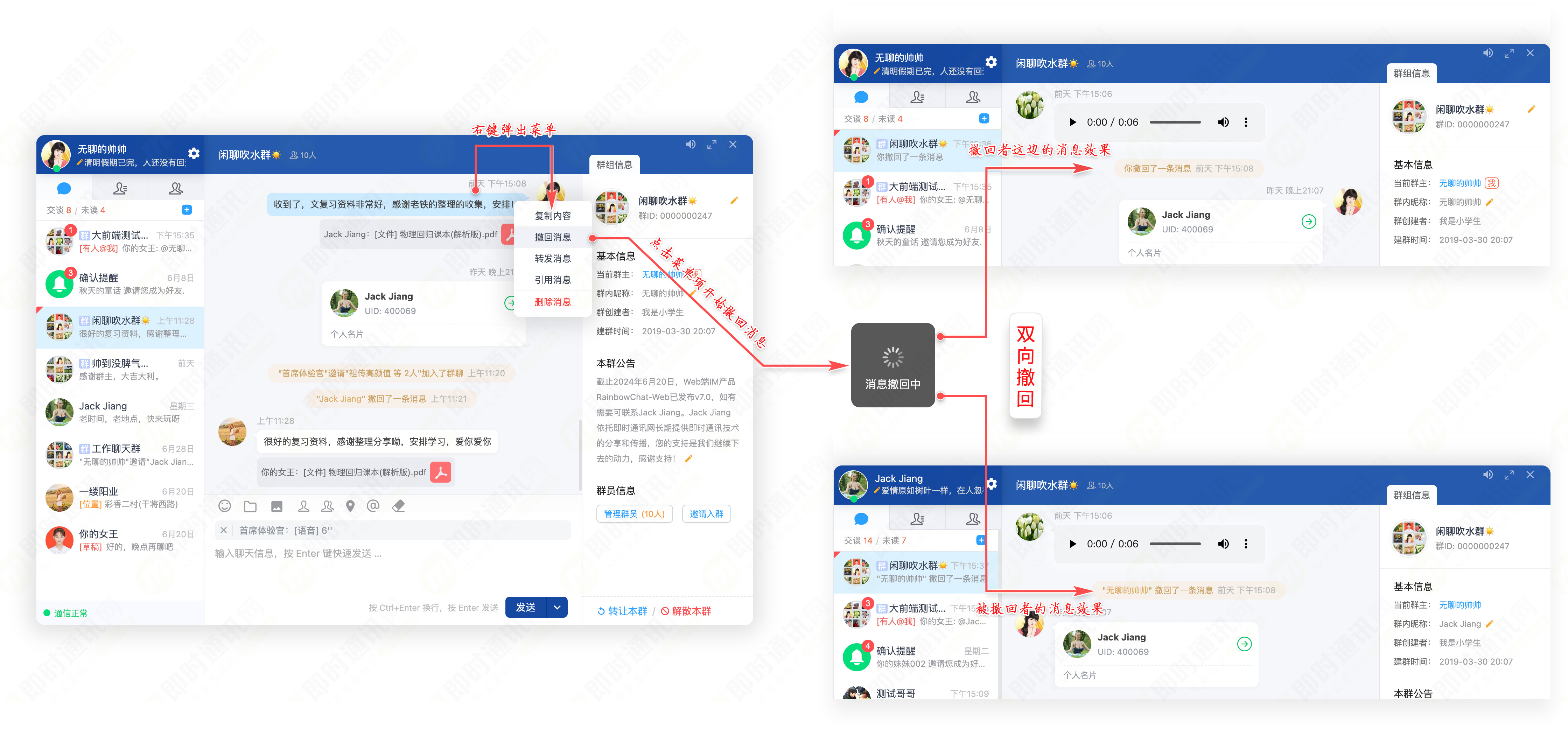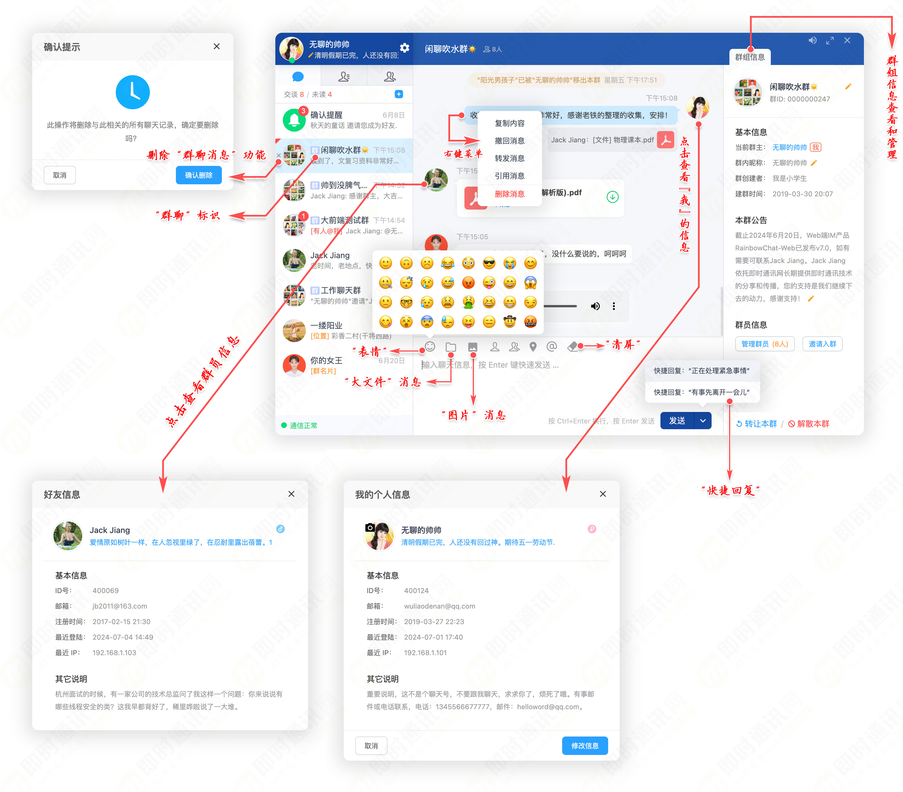 5、完善的群组信息管理:建群、退群、解散、转让、邀请、踢人、群公告等;