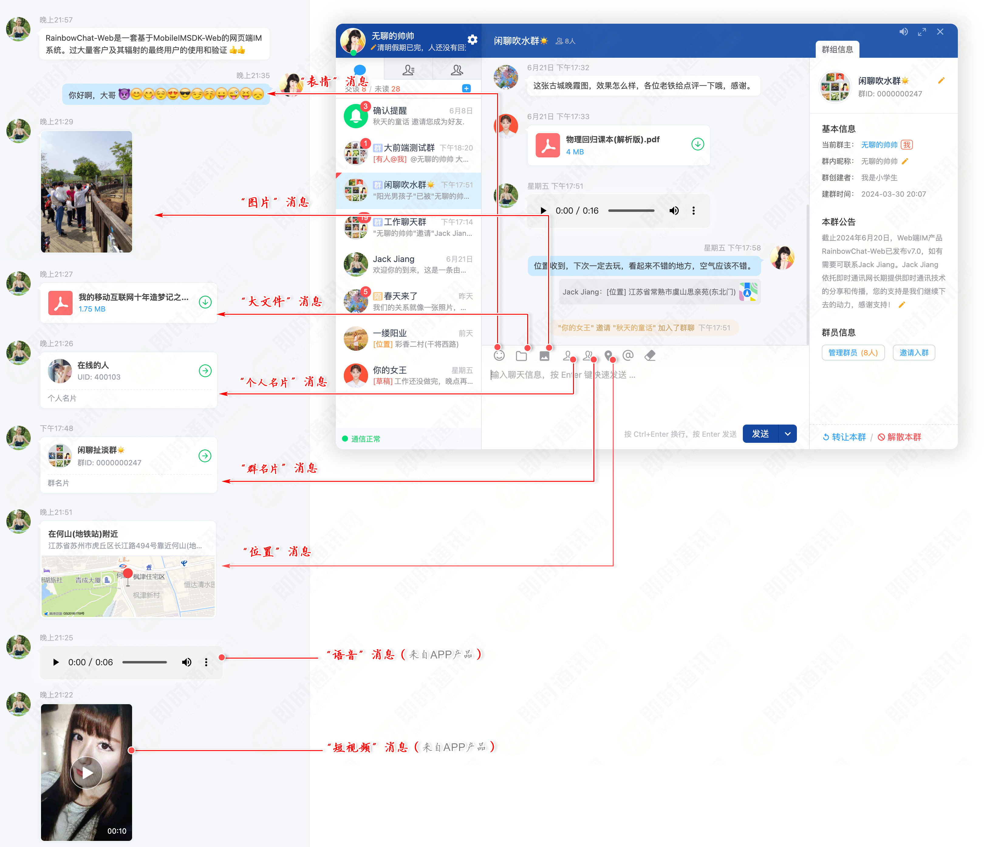 RainbowChat-Web是一套基于MobileIMSDK-Web的网页端IM系统。不同于市面上某些开源或淘宝售卖的demo级代码,RainbowChat-Web的产品级代码演化自真正运营过的商业产品,其所依赖的通信层核心SDK已在数年内经过大量客户及其辐射的最终用户的使用和验证。