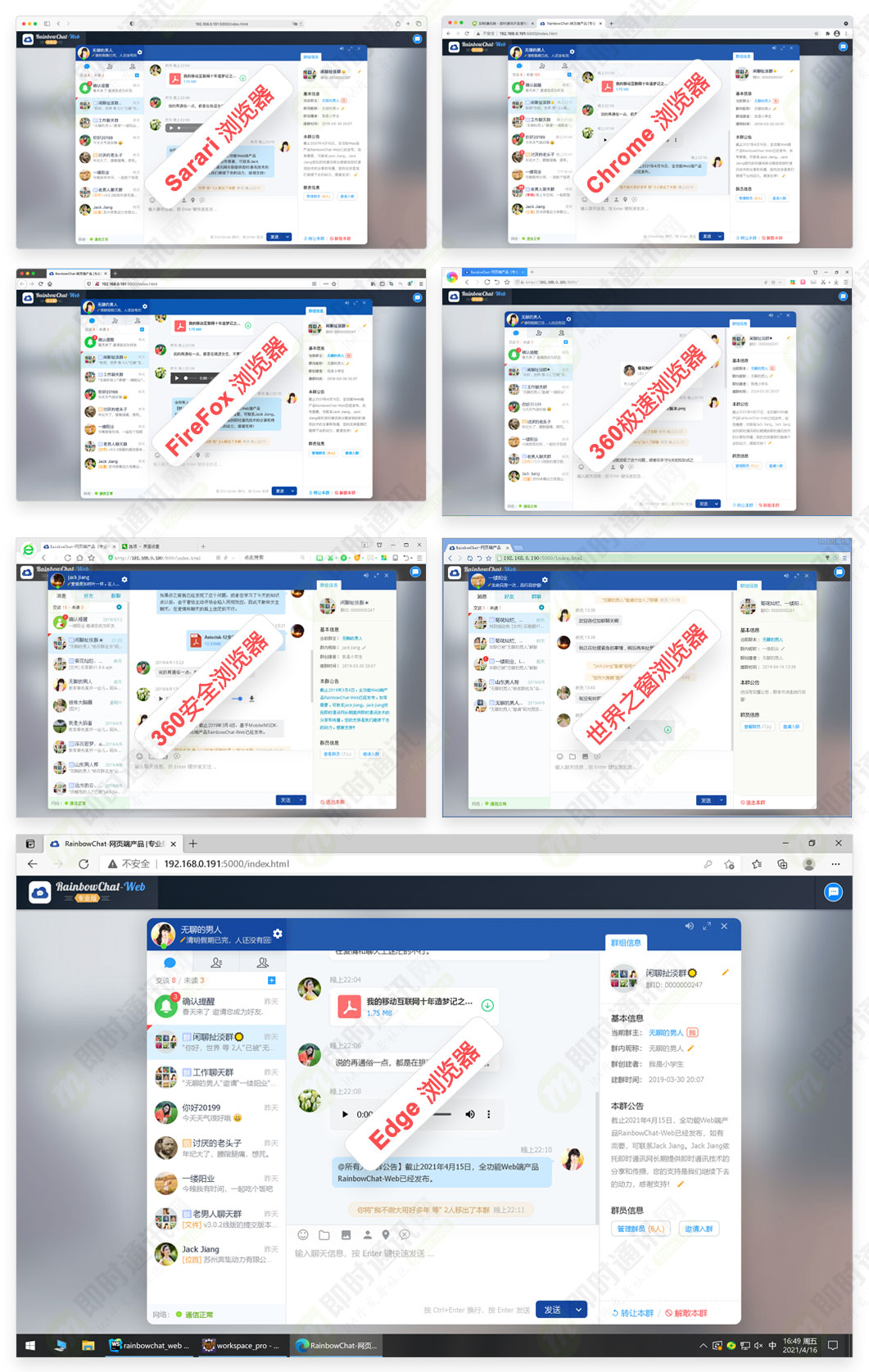 截止目前:RainbowChat-Web努力保证在各主流系统、主流浏览器、不同分辨率屏幕上的体验,包括但不限于:Chrome、Safari、FireFox、Edge、360浏览器、世界之窗浏览器等▼