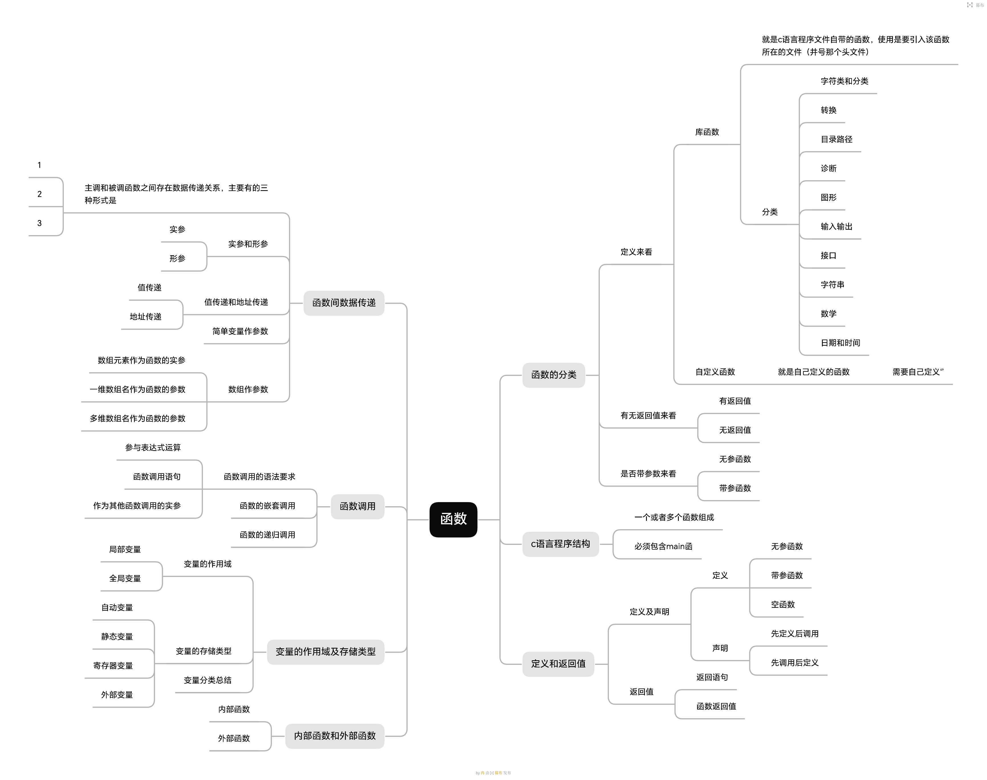 C语言函数可分为库函数和自定义函数。库函数包括字符分类(如islower())和转换函数(需包含ctype.h),用于字符判断和处理。自定义函数按返回值、参数分为多种形式,需先定义后调用。函数间通过实参形参传递数据,有值传递和地址传递两种方式。变量按作用域分局部/全局变量,按存储类型分自动/静态/寄存器变量。函数调用方式包括嵌套和递归调用,变量传递可使用简单变量或数组作为参数。程序由多个函数组成,