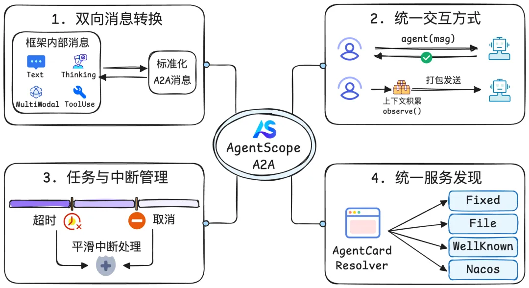 - AgentScope 层: 借助 A2AAgent 与 AgentCardResolver,我们提供统一的 A2A 对接能力和灵活的发现策略,默认集成 Nacos,支持动态 Agent 发现与调用。