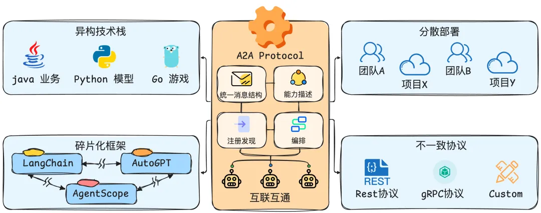 - 协议不统一: REST、gRPC、自定义协议…每个 Agent 都有自己的接口规范,集成成本高、维护困难。
