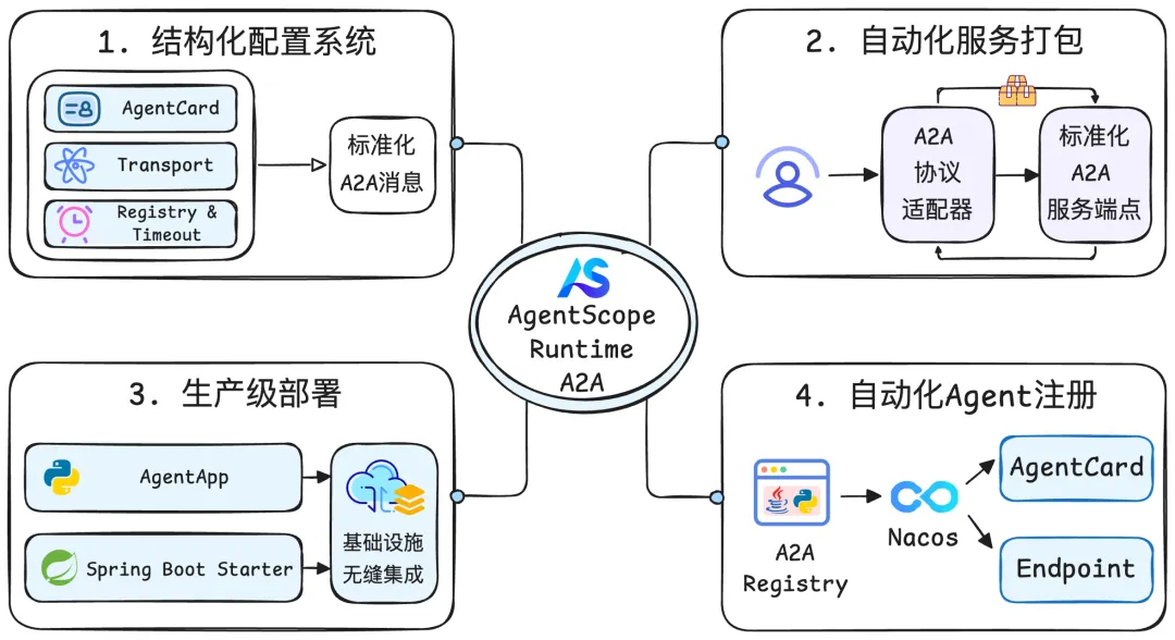 - AgentScope Runtime 层: 通过 A2A 协议适配器和 **A2ARegistry 抽象接口,提供统一的 A2A 服务暴露能力,支持自动服务注册与治理,与 Python AgentApp 和 Java Spring Boot Starter 无缝集成。