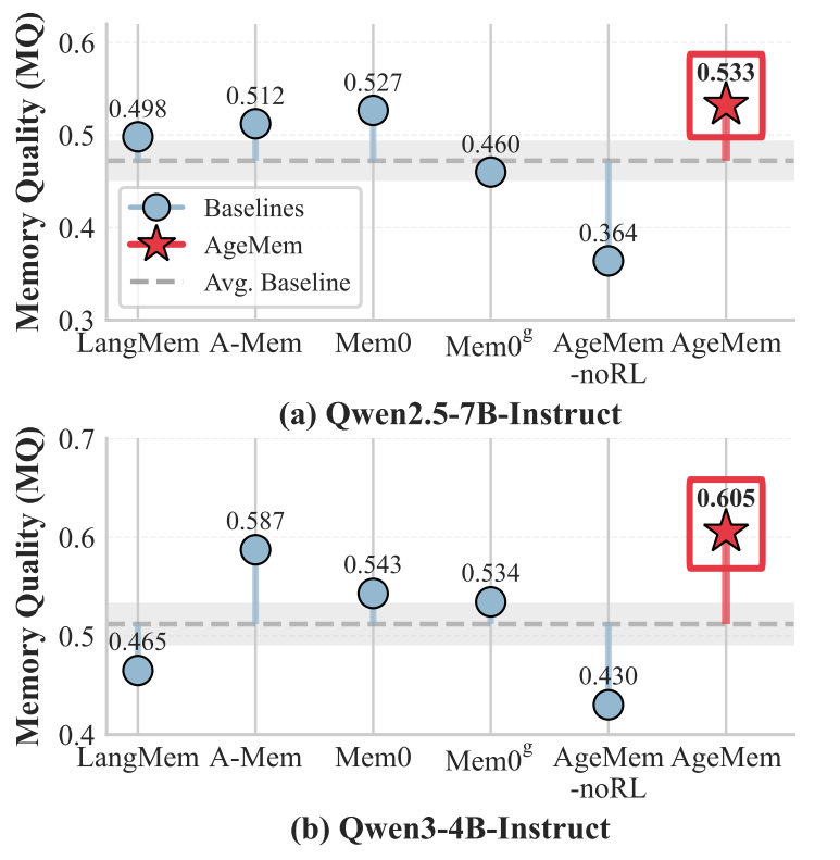 AgeMem在两个模型骨干上均取得最高记忆质量(MQ分数0.533和0.605),表明统一记忆管理框架不仅提升任务性能,还促进存储高质量、可复用知识。