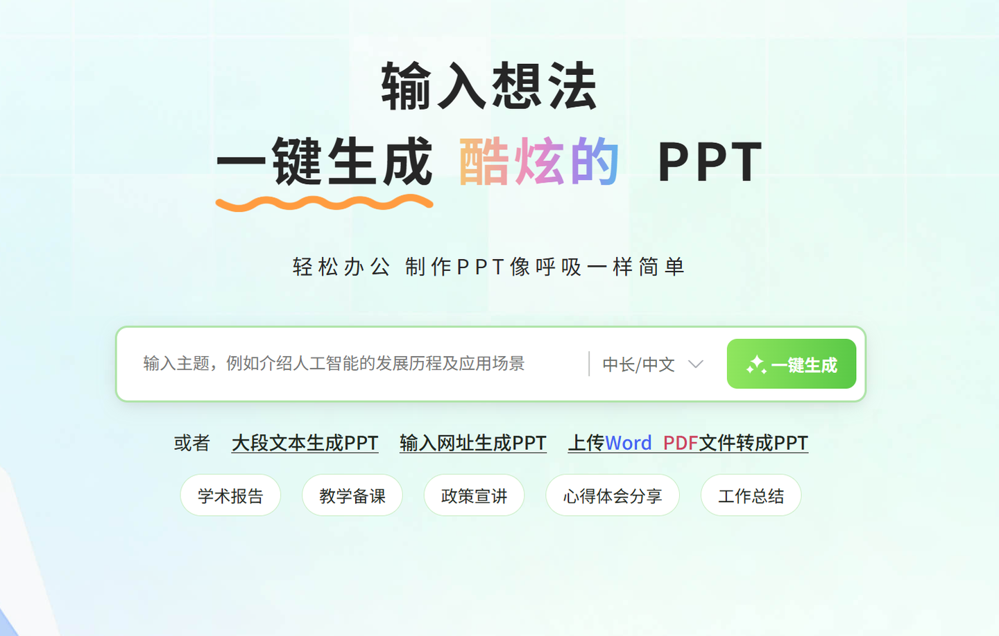 AIPPT是我最早接触的ppt一键生成免费工具之一,作为一款综合性较强的工具,它的适用人群很广泛,不管是学生做学术答辩PPT,还是职场人制作商务汇报,都能找到对应的解决方案。这款工具依托成熟的AI引擎,支持多种输入方式生成PPT,比如输入主题关键词、粘贴文本大纲,或者直接上传Word、PDF文档,都能快速转化为完整的PPT。我曾经试过上传一份3000字的工作总结文档,不到1分钟就生成了12页的PPT框架,内容逻辑清晰,还自动划分了章节标题,省去了我梳理结构的麻烦。