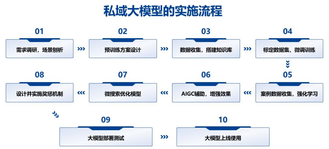 要构建一个真正能赋能工作的私域大模型,首先应该找一个精简的底座,这个底座需具备基本的人机交互、推理逻辑和语义理解功能。然后,用你所在领域的知识库进行预训练,再依据业务逻辑进行微调。此外,甚至可以通过强化学习来巩固学习效果。只有这样构建出的私域大模型,才能真正赋能我们的工作。