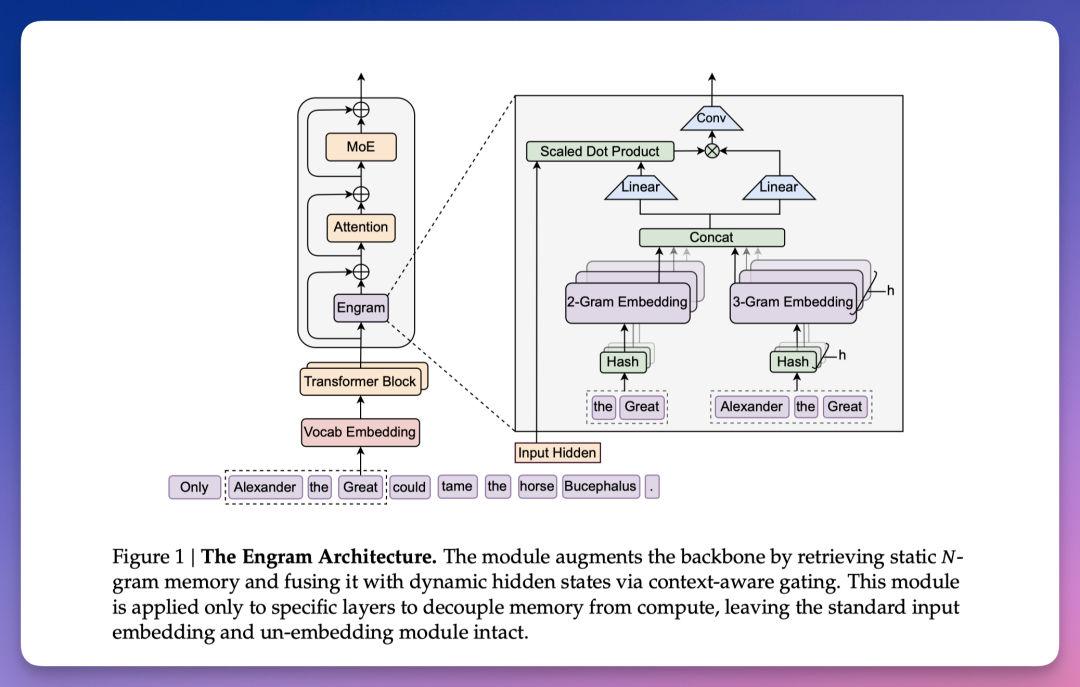 这个模块叫 Engram,本质上是对 N-gram 的现代化改造。