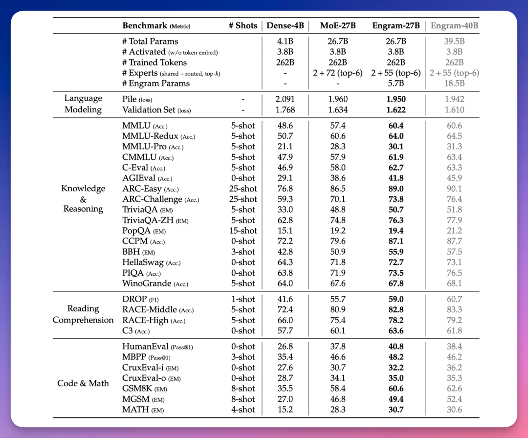 按这个分配,DeepSeek 训练了 Engram-27B,和 MoE-27B 对比。严格等参数、等算力。