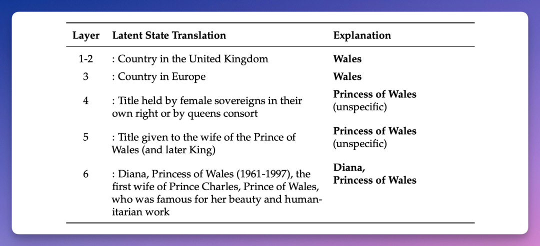 第 1-2 层,模型只知道「Wales」是英国一个地方。第 3 层,开始意识到这可能是个头衔。第 4-5 层,逐渐锁定「威尔士王妃」。第 6 层,终于确定是戴安娜王妃。