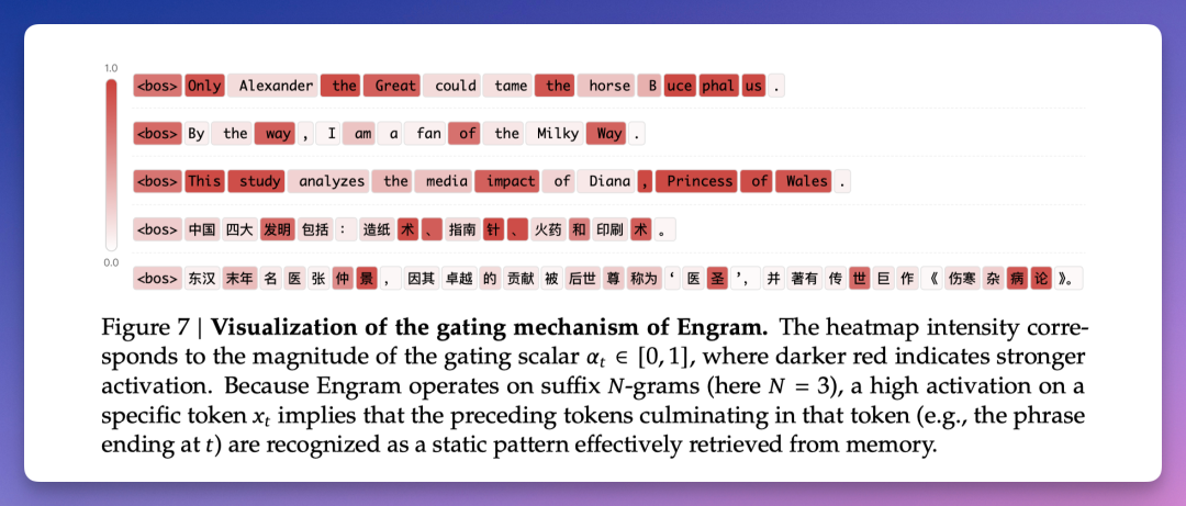 论文最后给了一组门控值的可视化,验证 Engram 确实在识别和检索固定的语言模式。