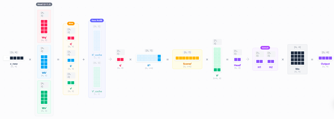 于是真正的计算流程就变成了这样,对于K和V,我们只要把新计算的K和V提出来,和新计算的以及拼接上即可: