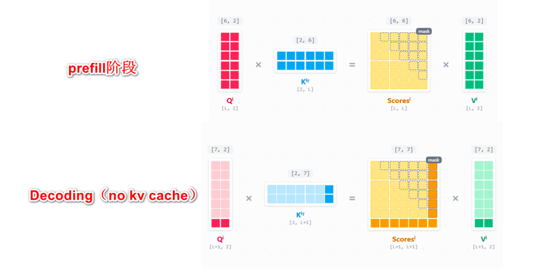 如果没有kv cache,我们完整的迭代计算prefill之后的每一个next token,其过程都是要完整的计算一遍所有内容,和prefill阶段没有任何区别。