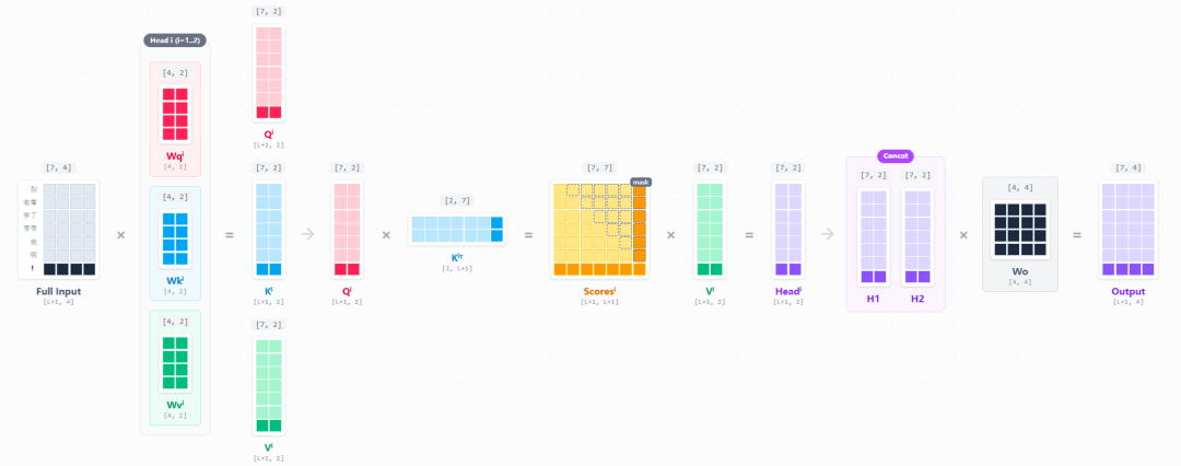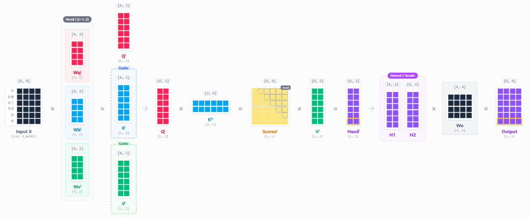 用一个简化的例子来推一下,如果我的输入是“别偷着学了带带我啊”,可以表示为[“别”, “偷着”, “学了”,“带带”,“我”,“啊”]。我们简化维度,设为6。也就是一个token会被表示成一个[1, 4]的向量,合起来就是一个[6, 4]的矩阵。在一个多头注意力下,我们的head为2,则会得到如下过程: