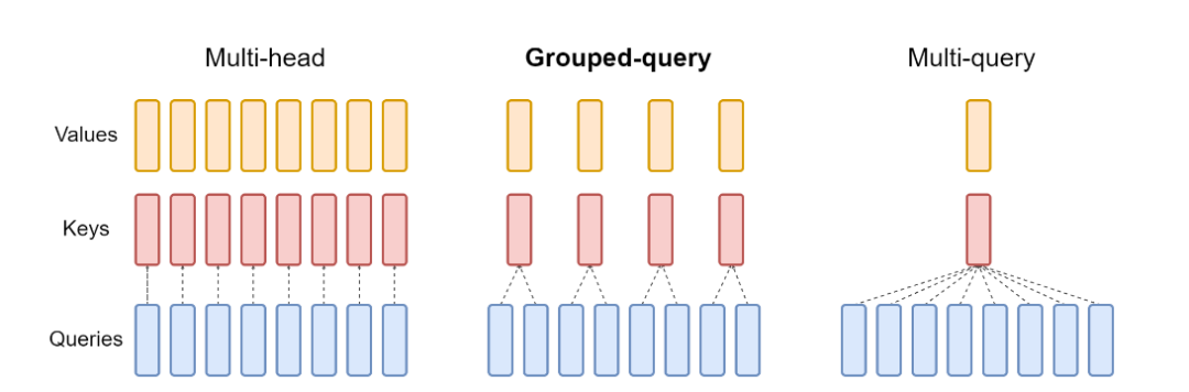 GQA 则通过将查询头分组并让每组共享一组键值头,提供了一个可灵活配置的权衡点,允许模型开发者在推理速度和模型质量之间进行更精细的平衡。