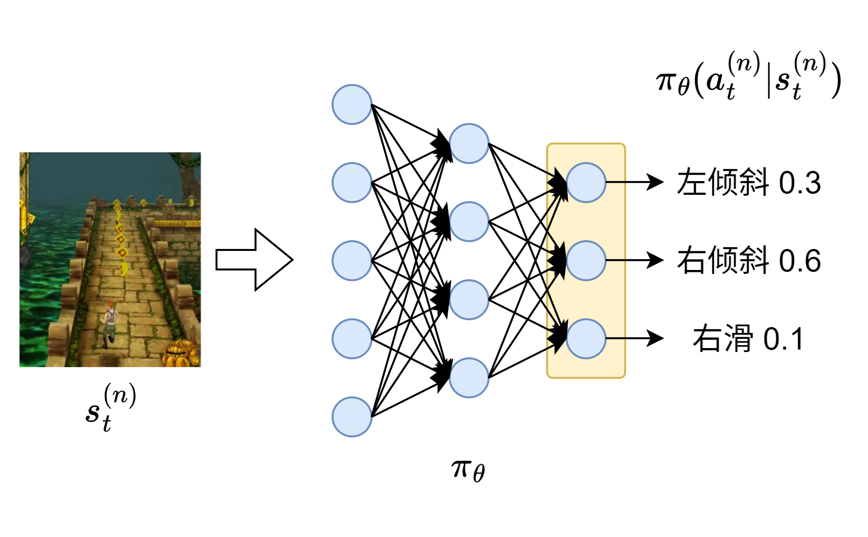 - π θ ( τ ) \pi_\theta(\tau) πθ(τ):在基本概念中说 π \pi π指的是Action的概率分布,这里不严谨,因此用更具体的 π θ ( a t ∣ s t ) \pi_\theta(a_t|s_t) πθ(at∣st)来表示将当前的游戏状态 s t s_t st输入给网络、然后输出在 s t s_t st的条件下各动作 a t a_t at的概率分布,下标 θ \theta θ可带可不带,主要表示该策略网络的参数。而 π θ ( τ ) \pi_\theta(\tau) πθ(τ)表示通关方式的概率分布。(下图中使用神经网络示意图来表示任意的网络模型)