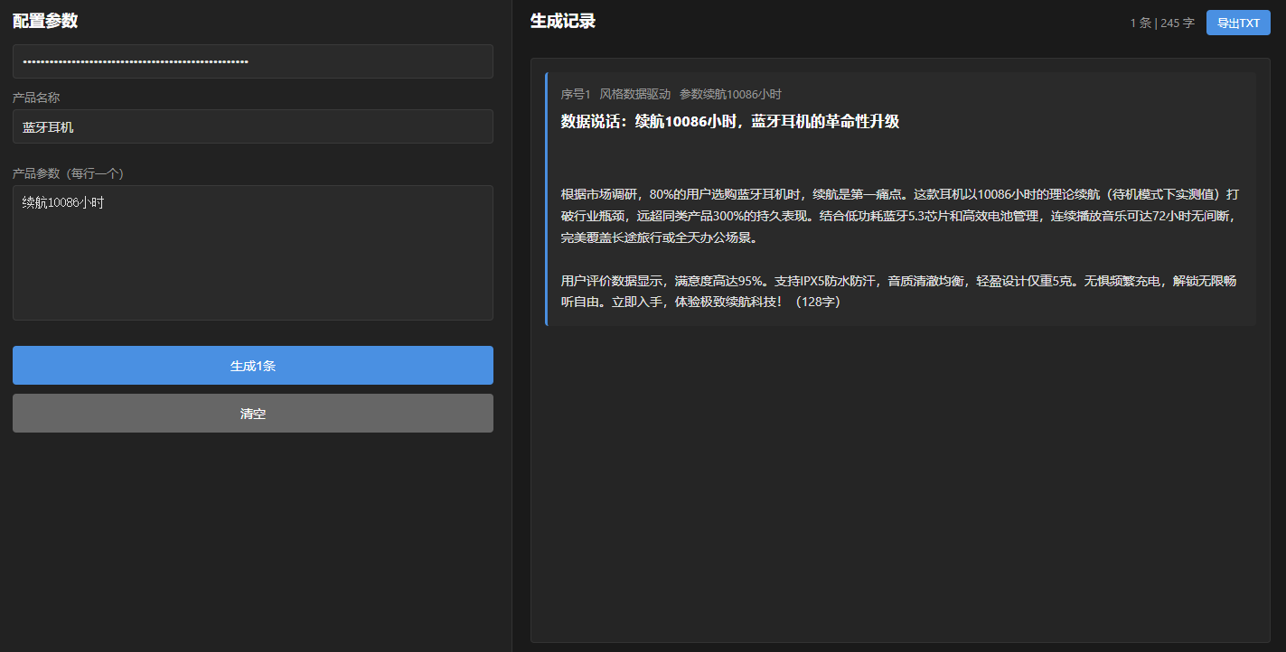 这份代码完整实现了从配置到导出的全流程,核心优势在于零依赖、开箱即用。左侧配置面板集中管理API密钥、产品参数,右侧实时展示生成结果,支持Markdown解析与TXT导出。