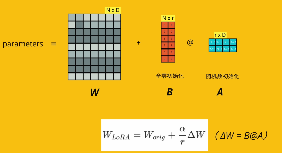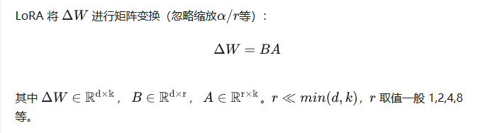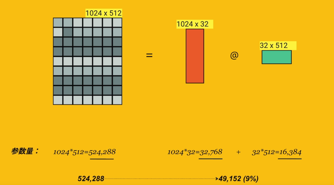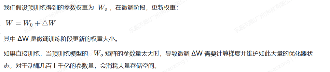 LORA通过引入低秩矩阵来减少模型参数的更新量,进而显著降低训练的计算开销,同时保持微调的性能。由于LLM参数量巨大,直接微调耗费大量资源,LORA的做法是冻结模型的绝大部分参数,只更新很小一部分参数。这就像修车时不需要重造整辆车,而是只修理一些特定的部件。