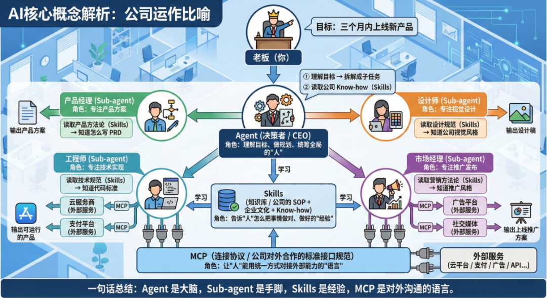 AI智能体四核心概念解析:以公司运营为比喻,理解Agent、Sub-Agent、Skills与MCP的协作关系