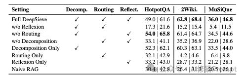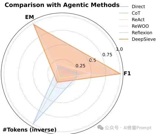 - 精度:在所有基准测试中,DeepSieve的平均F1分数和EM(精确匹配)分数,都显著超越了所有这些强大的对手。