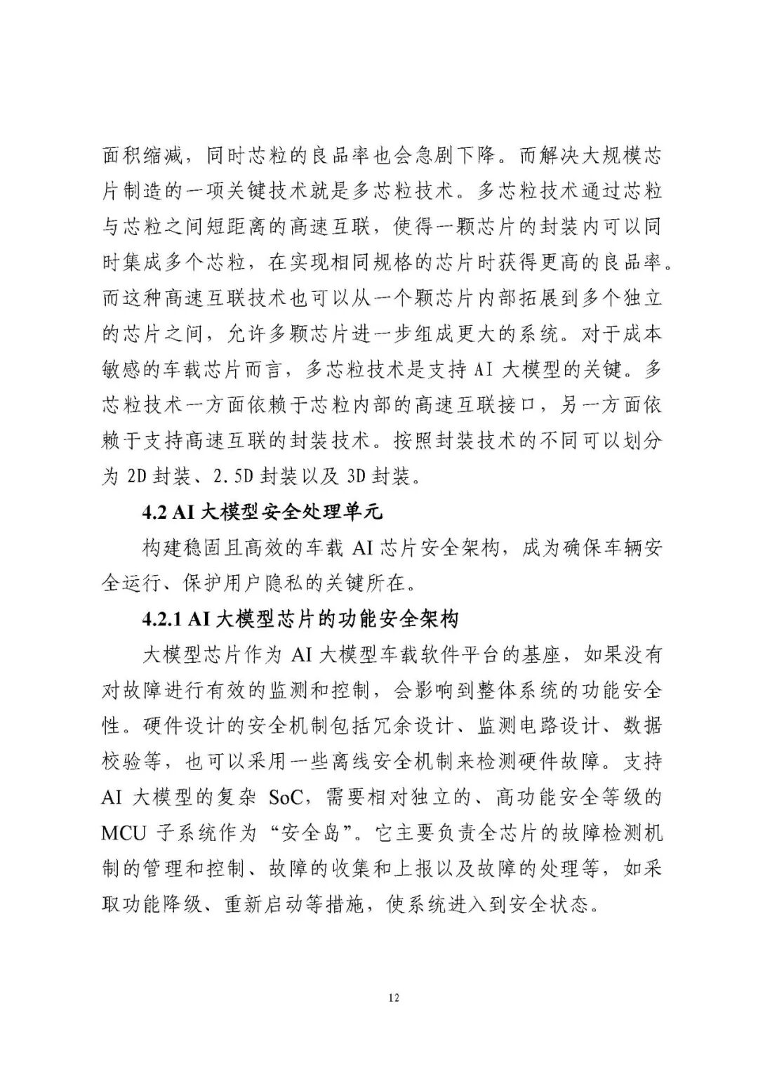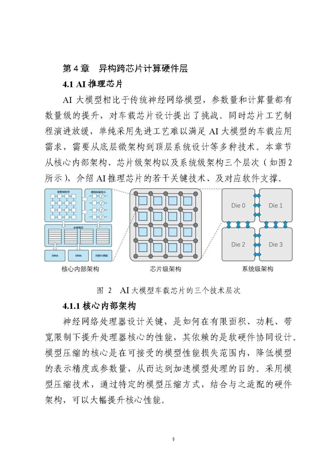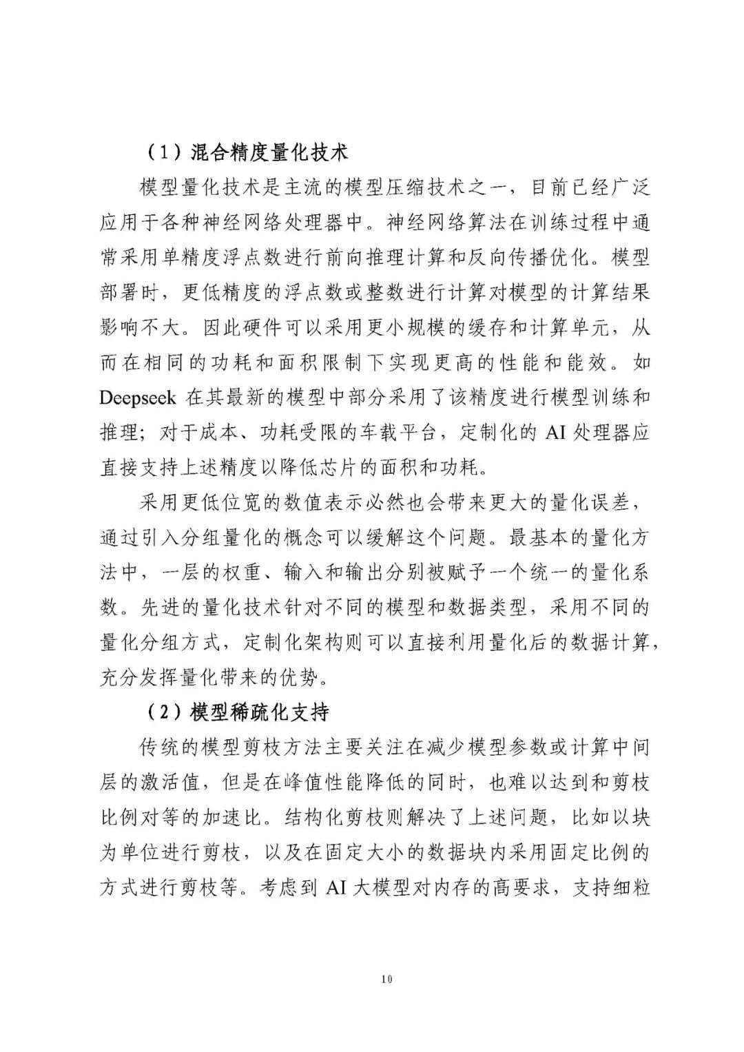 AI 推理芯片从核心内部架构、芯片级架构、系统级架构三个层次优化设计,采用混合精度量化、模型稀疏化、多核心并行、多芯粒等技术,满足 AI 大模型对算力、功耗、成本的要求;AI 大模型安全处理单元构建功能安全和信息安全架构,保障芯片安全运行。