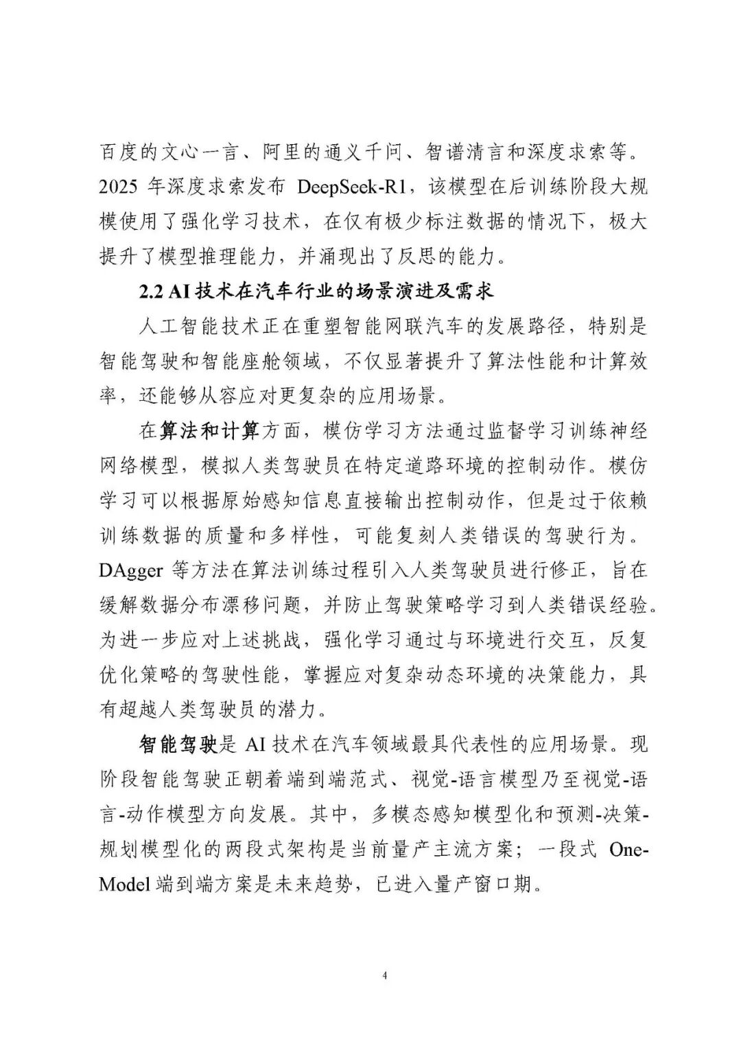 AI 技术已深度渗透到智能驾驶和智能座舱等核心领域。智能驾驶方面,正朝着端到端范式、视觉 - 语言模型乃至视觉 - 语言 - 动作模型方向发展,模仿学习、强化学习等算法不断优化,以应对复杂动态驾驶环境;智能座舱借助 AI 大模型实现语音识别、自然语言处理、情感分析等功能,结合云端计算与本地设备响应,在保障隐私的前提下提供个性化服务,提升驾乘体验。