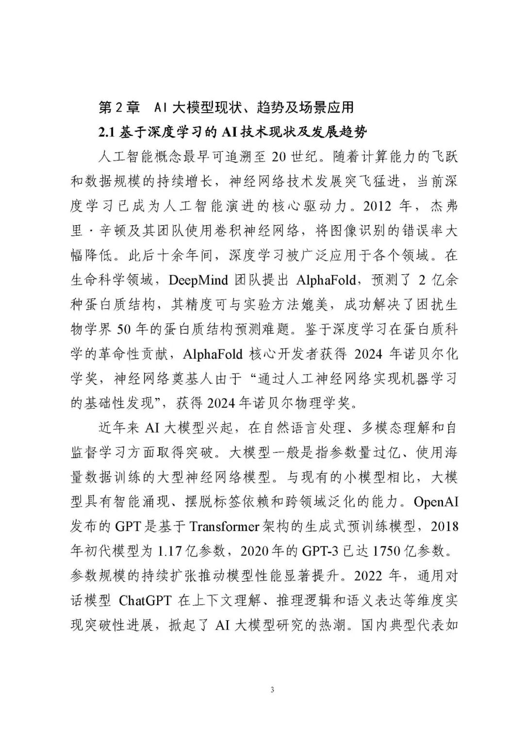 深度学习是当前人工智能演进的核心驱动力,近年来 AI 大模型兴起,在自然语言处理、多模态理解和自监督学习方面取得突破。大模型参数量大、依赖海量数据训练,具备智能涌现、摆脱标签依赖和跨领域泛化能力,参数规模的扩张推动其性能持续提升,国内也涌现出百度文心一言、阿里通义千问等典型代表。