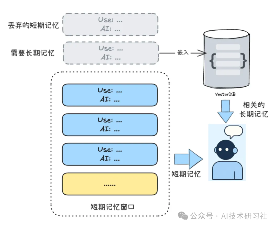short_term = SlidingWindow(max_turns=2)long_term = VectorDatabase(k=2)promotion_keywords = ["记住", "我喜欢", "总是"]def add_message(user_input, ai_response): short_term.add(user_input, ai_response) if any(k in user_input for k in promotion_keywords): summary = summarize(user_input + ai_response) vector = embed(summary) long_term.add(vector, summary)def get_context(query): recent = short_term.get_context() vector_query = embed(query) related = long_term.search(vector_query) return f"【长期记忆】\n{concat(related)}\n\n【当前上下文】\n{concat(recent)}"