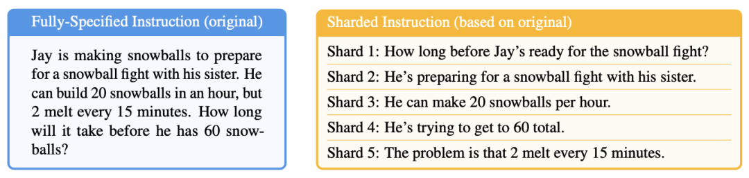 微软和Salesforce团队在最近的一篇论文中出色地记录了这一点。团队从多个基准中提取提示,并将其信息"分片"到多个提示中。可以这样想:有时候,可能会坐下来在ChatGPT或Claude中输入段落,在按回车之前考虑每个必要的细节。其他时候,可能从一个简单的提示开始,然后在聊天机器人的答案不令人满意时添加更多细节。微软/Salesforce团队修改基准提示,使其看起来像这些多步骤交流: