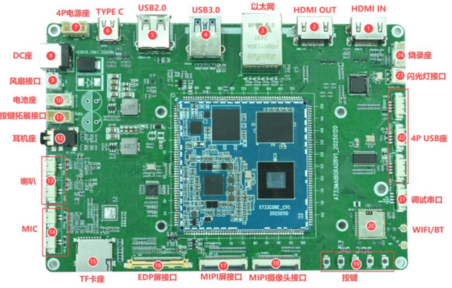 • 音视频与调试接口:提供 1 路 MIPI-CSI 摄像头接口,支持高清图像采集;配备 2 路 MIC 输入、2 路喇叭输出与 1 路耳机接口,满足音频输入输出需求;板载调试串口与烧录座,方便开发过程中的程序调试与固件更新。