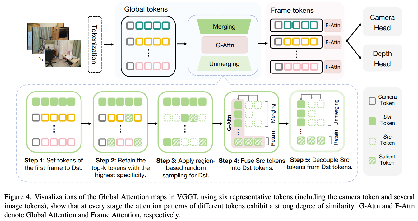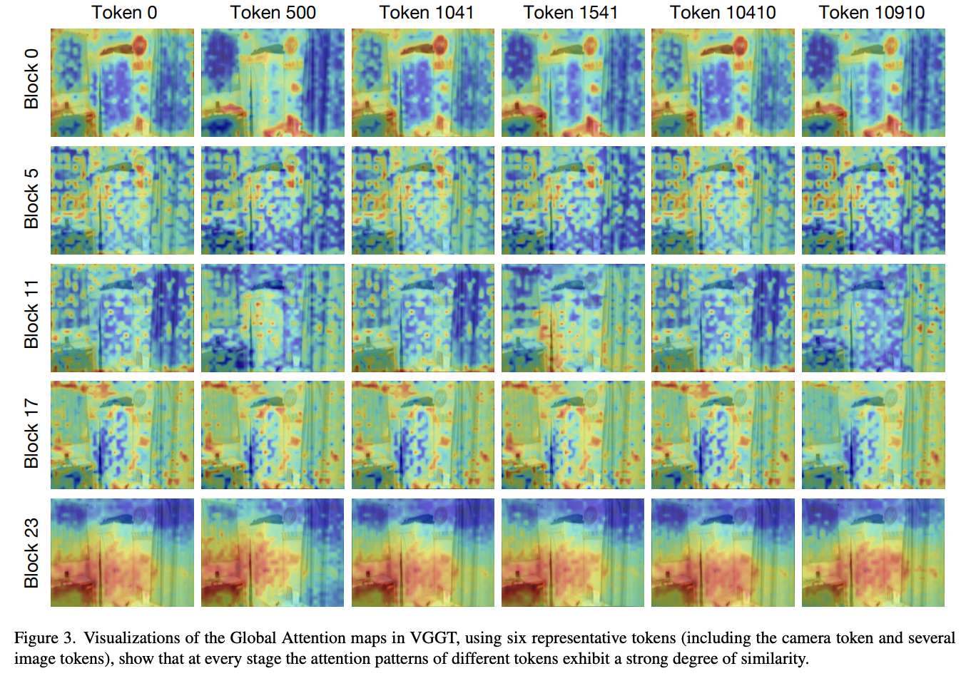 - 在 VGGT 的 Global Attention 中,同一 Block 下不同 token 的注意力图几乎重合,说明大量 token 之间的信息存在冗余,许多计算并未引入新的信息。