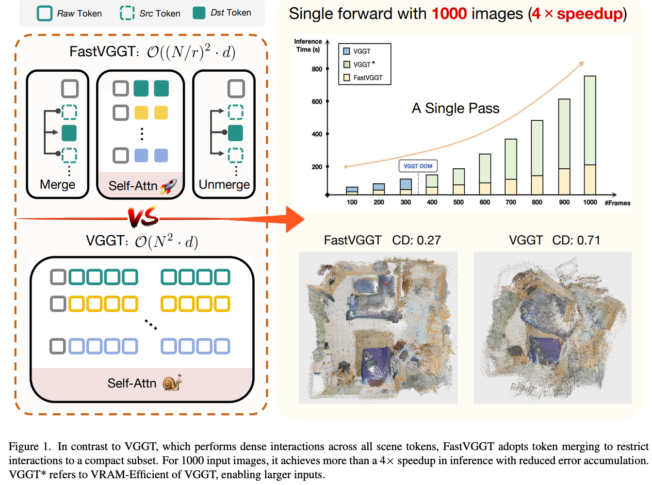 - 提出FastVGGT,在 1000 张图像推理任务中实现 4× 加速,并有效降低了 VGGT 的累积误差。