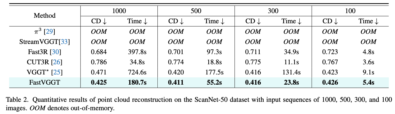 - 结果:FastVGGT 相比 VGGT*,在 1000 帧输入下加速 4倍(724.6s → 180.7s),并具有更好的重建质量(0.471 → 0.425)。