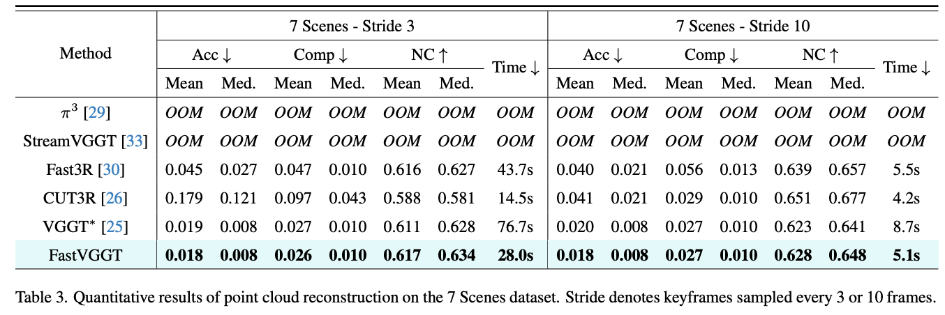 - 结果:FastVGGT 在 7Scenes 与 NRGBD 上延续了 ScanNet 实验的结论:在显著缩短推理时间的同时,仍保持了 VGGT 的强大重建性能。