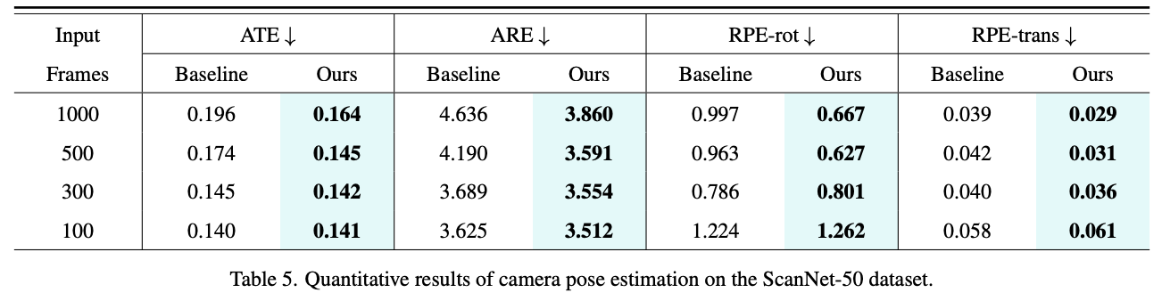 - VGGT* 作为 baseline(显存优化版本的VGGT,在前向过程中手动清理VGGT encoder产生的中间变量,使得A800可以塞入1000张image)